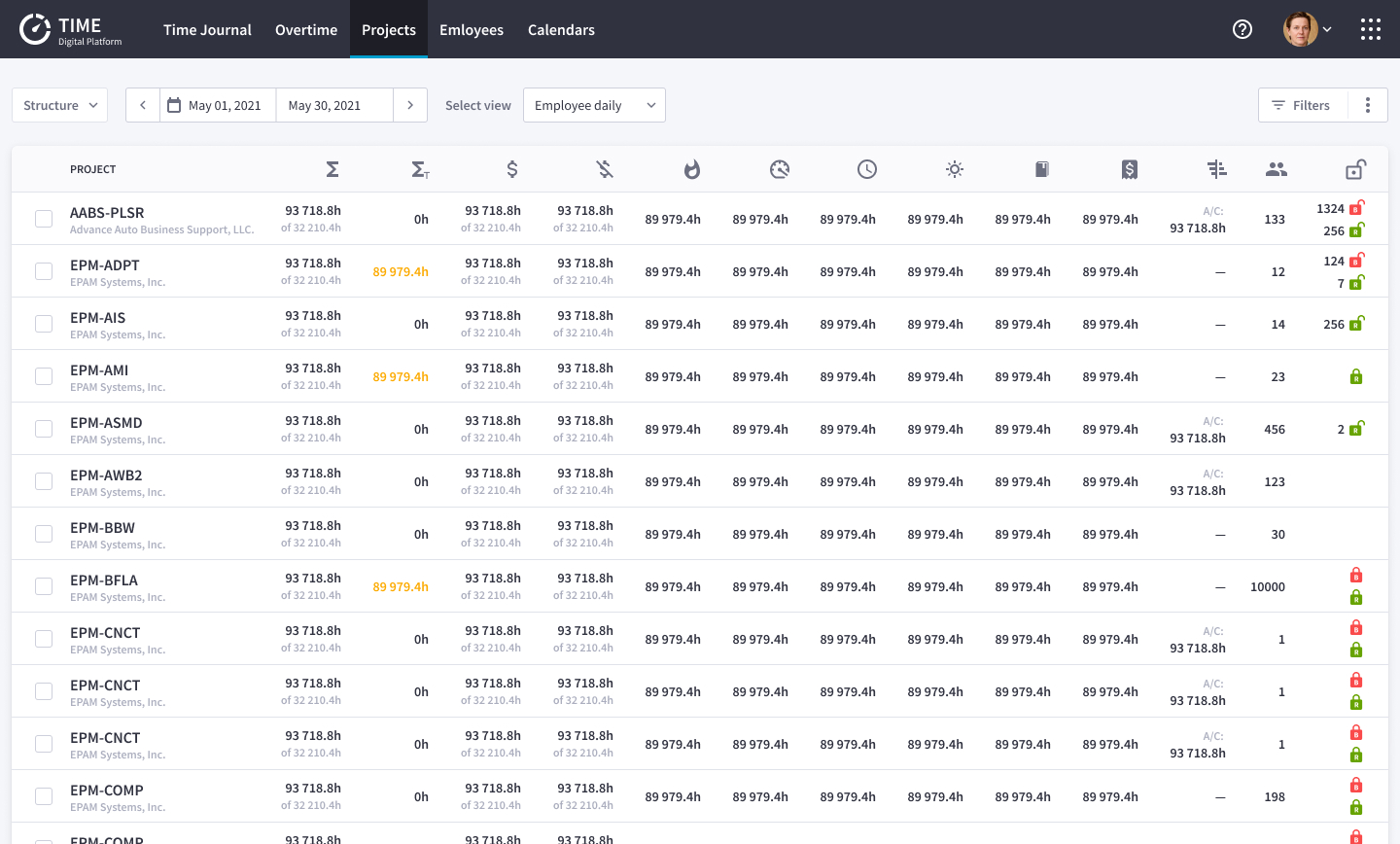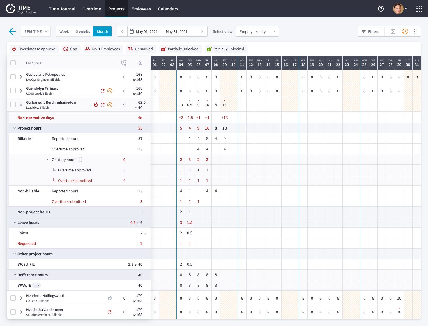 From the list of projects/customers, you can drill down into the list of employees. I added advanced filtering and quick highlighting of problematic indicators.