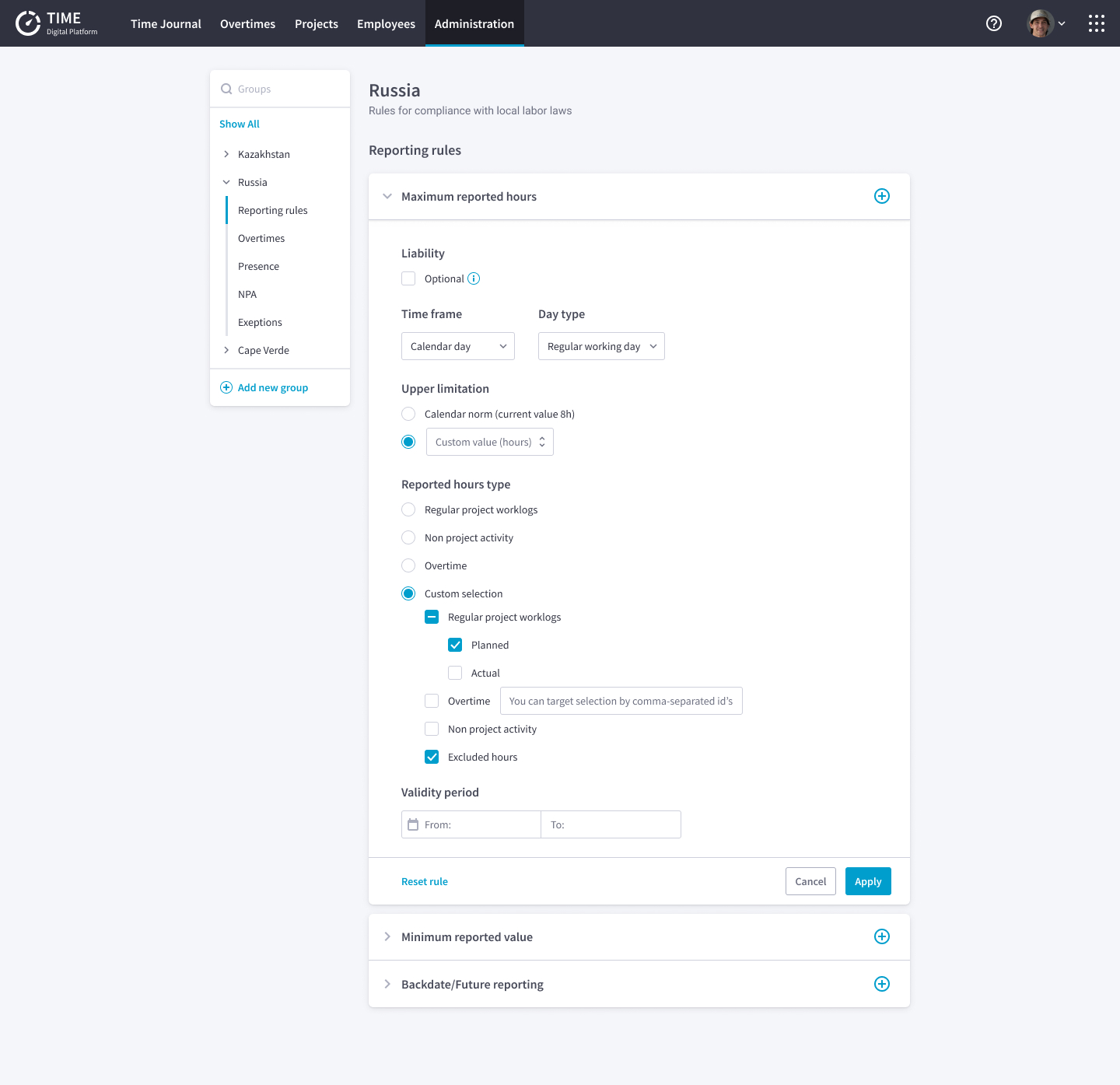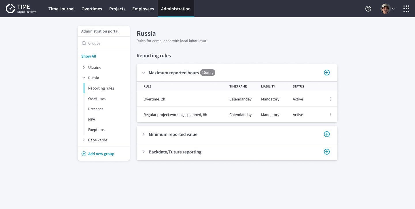 In the admin section, I developed features for configuring time-tracking rules and local calendars for different countries.
